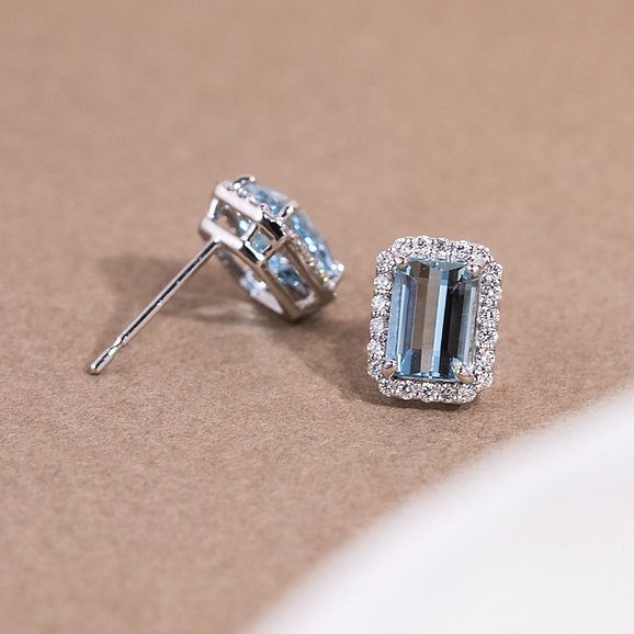 Elevate your style with a touch of romance. The Chunky Earrings exude an aura of love and elegance, adorned with dazzling pavé-set diamonds that delicately frame the exquisite emerald-cut Aquamarine gem at their center.