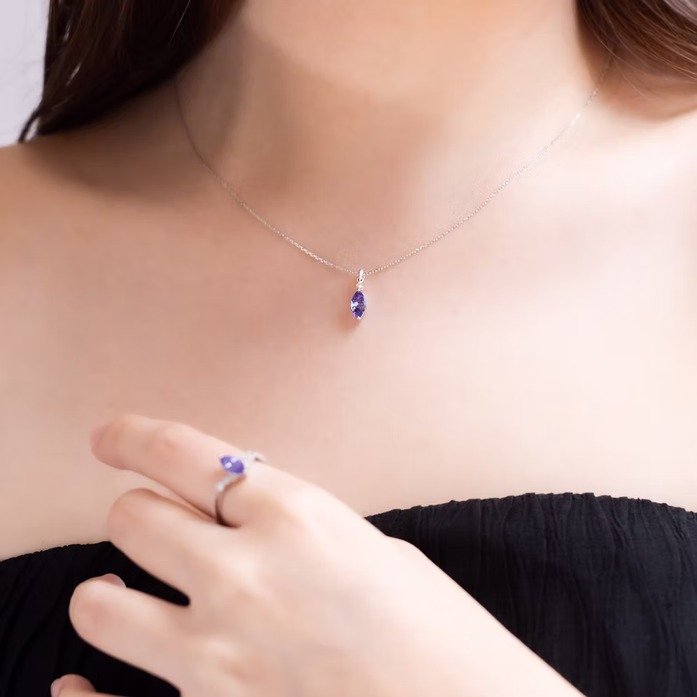 The ring centres around an exquisite, deep violet Marquise-cut Tanzanite, set in enduring platinum and adorned with a round brilliant-cut diamond and delicate details.