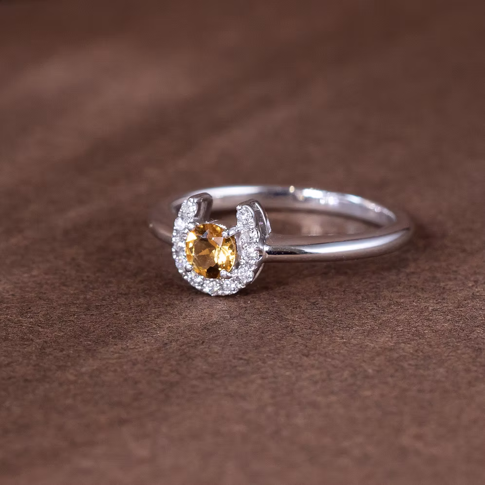 The Citrine Horseshoe Ring radiates warmth and positivity, featuring a vibrant citrine gemstone that captures the golden glow of sunlight. The horseshoe design, a symbol of luck and protection, cradles the citrine in a graceful arc, while a polished band adds a touch of sophistication. Perfect for those who cherish optimism and elegance, this ring brings a bright, cheerful charm to any occasion.
