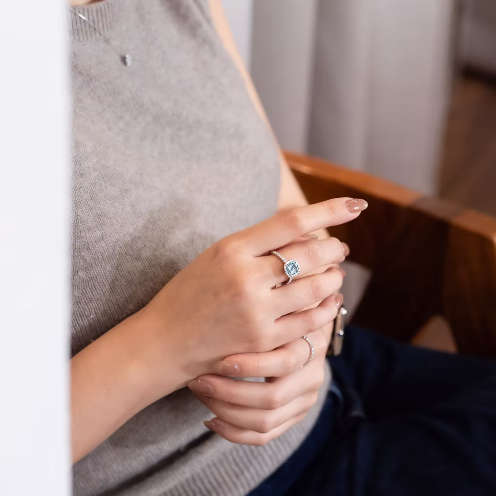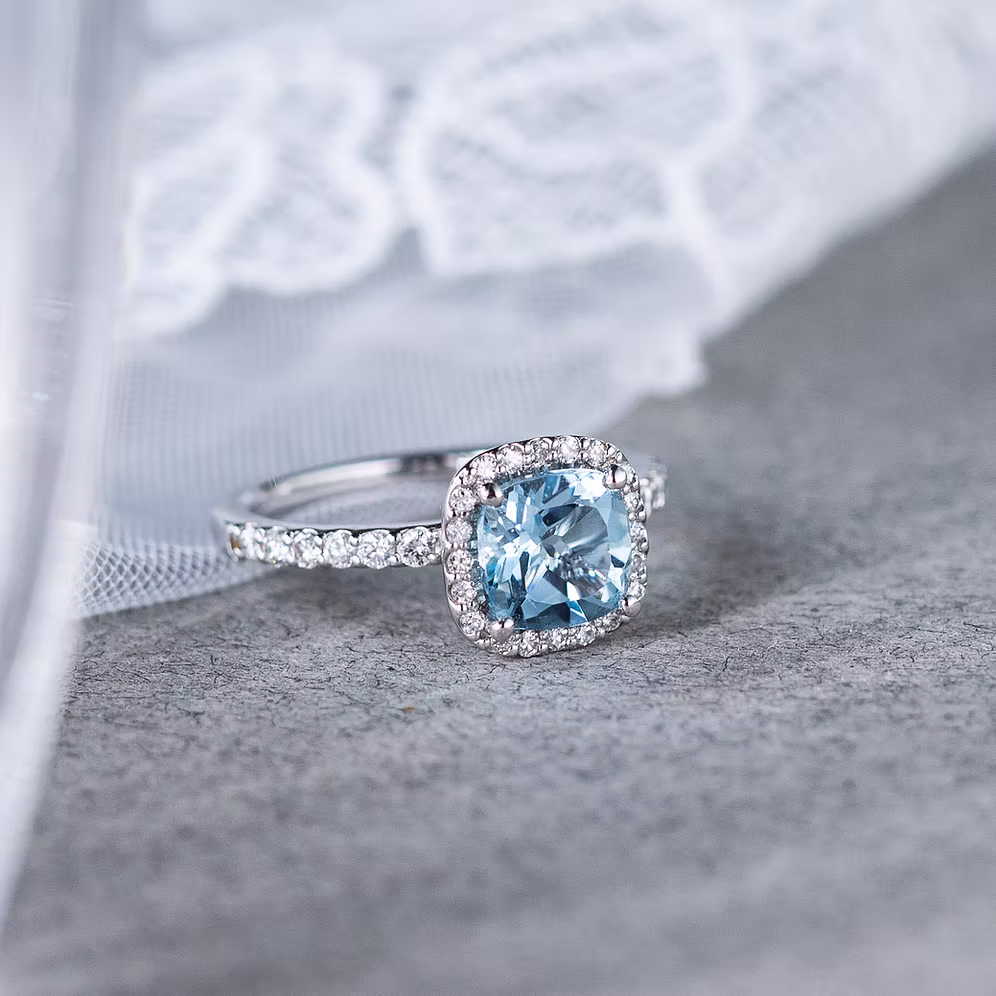 This exquisite cushion cut aquamarine halo ring features a 1.50-carat aquamarine stone, renowned for its captivating blue hue. The stunning stone is set in a beautifully crafted halo design, enhancing the aquamarine’s brilliance and showcasing its perfect cut.