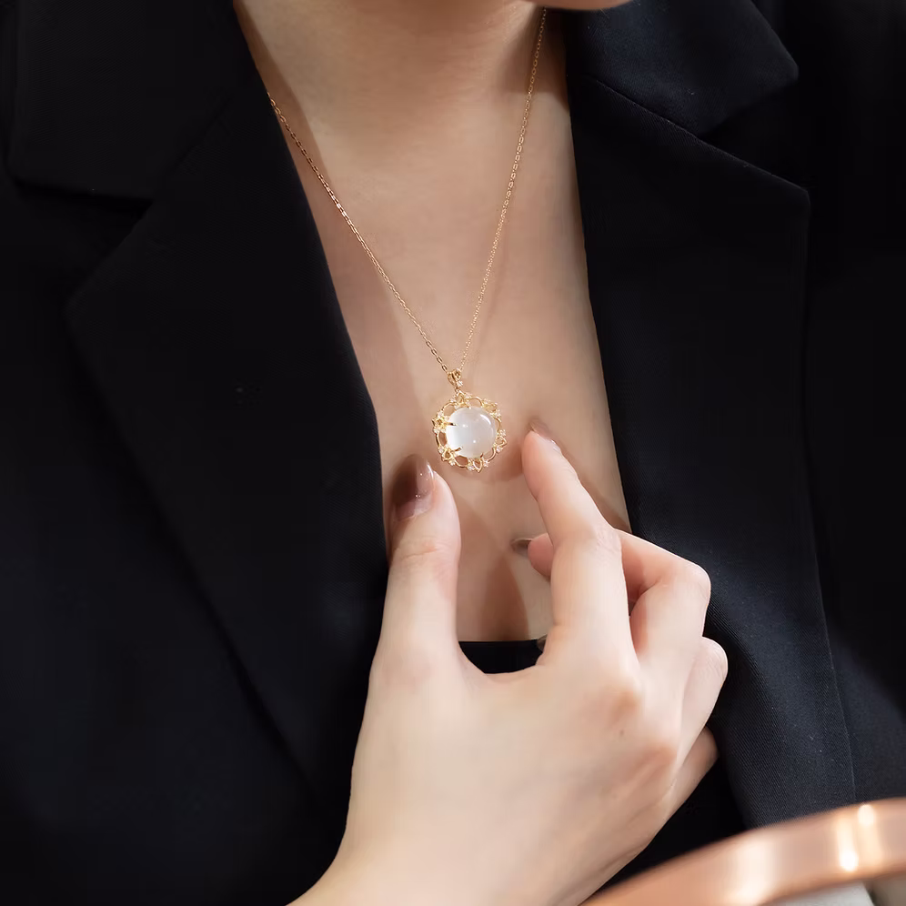 Introducing Eclipsa, a mesmerizing yellow gold necklace adorned with a stunning 10-carat sized Cat’s Eye Moonstone centerpiece, evoking the celestial beauty of an eclipse.