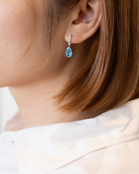 A refined expression of light and movement, Lume dazzles with effortless elegance. A sleek bar of melee diamonds catches the light with every turn, leading to a luminous pear-shaped Blue Topaz that sways gracefully below. Set in platinum, these earrings embody modern sophistication, where brilliance and fluidity come together in perfect harmony.