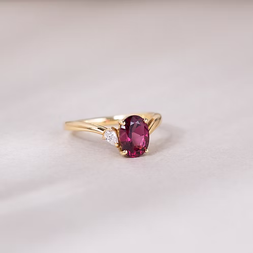 The Lyra Ring features an oval-cut rhodolite garnet, admired for its rich raspberry hue and soft inner glow. Neither too red nor too purple, the stone reveals depth and warmth as it catches the light, offering a refined expression of colour that feels both timeless and contemporary.