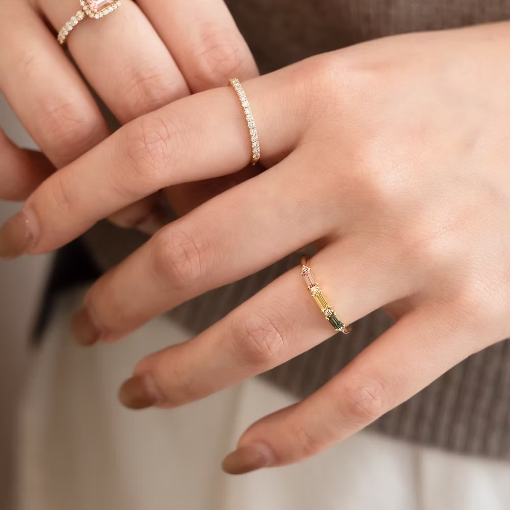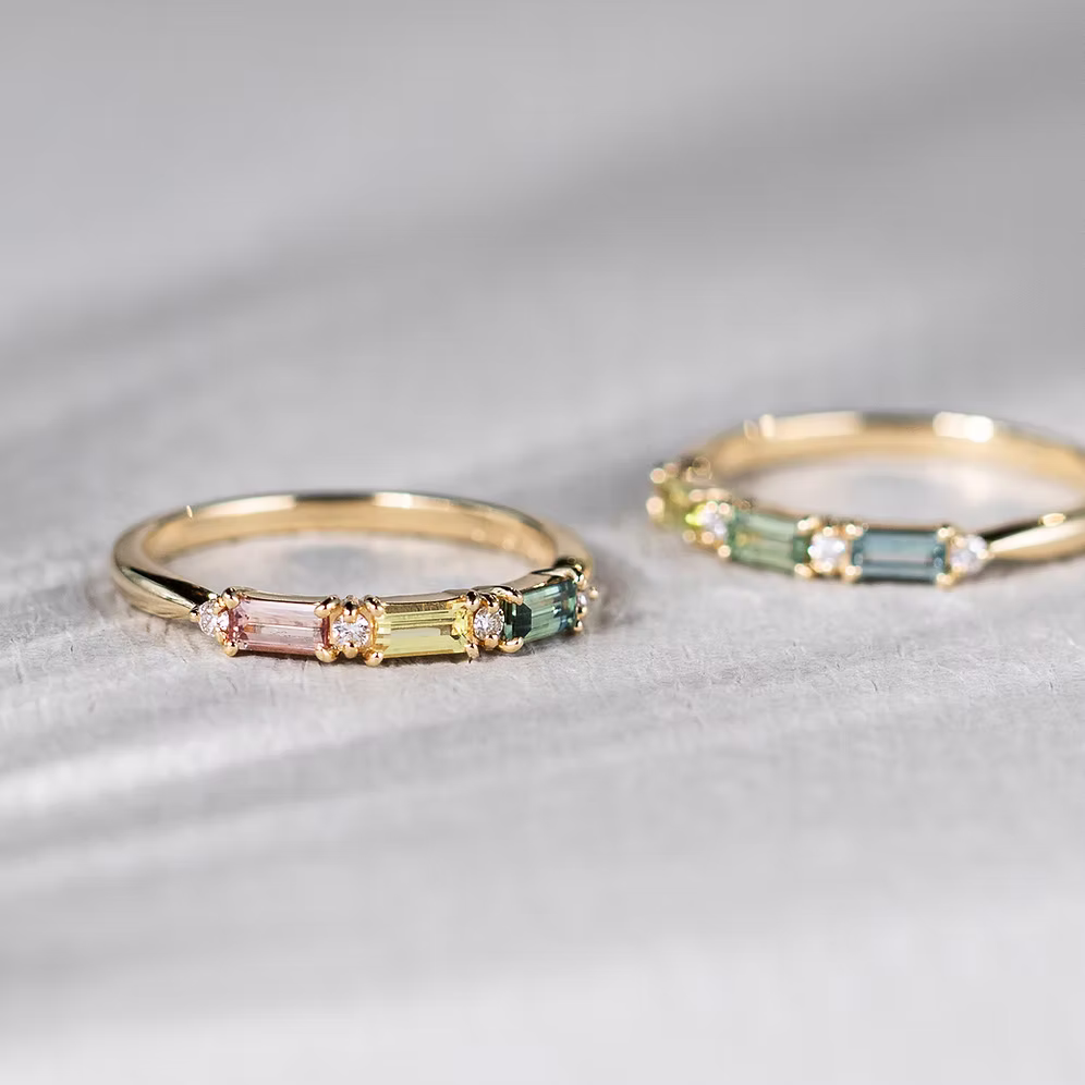 A soft harmony of colour and light, the Palette Ring features pastel-hued sapphires in elegant baguette cuts, arranged side by side in a delicate band. Inspired by an artist’s colour palette, each ring is a quiet celebration of subtle beauty—an effortless way to wear colour in your everyday. The sleek, linear form of the baguette-cut stones brings a modern edge, while the gentle tones—from blush pink to icy blue—add a whisper of charm and personality to your stack or worn solo.