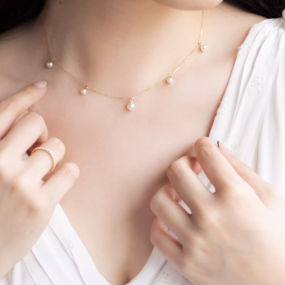 Designed to lay elegantly against you décolletage, our Station Necklace from Poetic Pearl Collection is handmade from solid 18 karat gold and strung with fine glossy akoya pearls. Wear it solo or layered with longer necklaces.