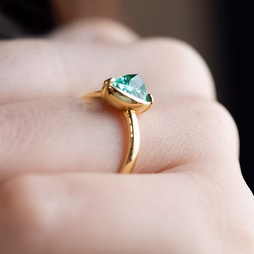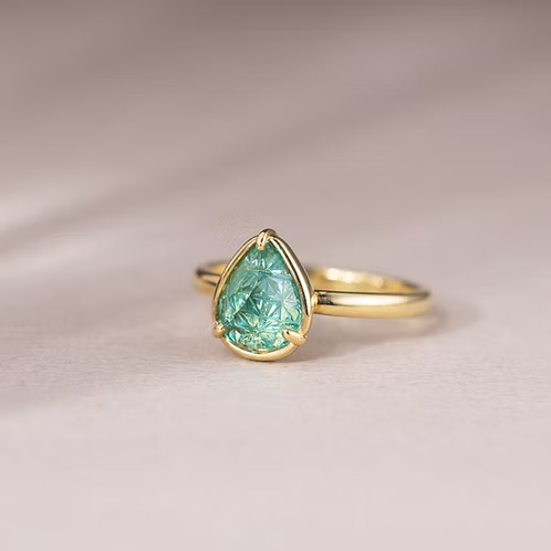 A pear-shaped Kiriko-cut Takumi Emerald ring set in 18K Yellow Gold, featuring rhythmic facets inspired by Japanese Kiriko artistry that amplify the stone’s vivid green brilliance.